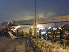 Движение автотранспорта на Киевском шоссе было частично восстановлено. Ранее движение в обоих направлениях было перекрыто из-за аварии с самолетом Ту-204 в аэропорту "Внуково". Воздушное судно выехало за пределы взлетно-посадочной полосы, развалилось на три части и загорелось. Жертвами крушения стали три человека.  | На Киевском шоссе образовался затор из-за упавшего Ту-204 В Подмосковье на участке Киевского шоссе вблизи аэропорта "Внуково" образовалась пробка в обоих направлениях. Причиной образования затора стало падение пассажирского самолета Ту-204 авиакомпании Red Wings. Длина пробки в сторону области по данным на 17:06 по московскому времени составляет более двух километров.  |