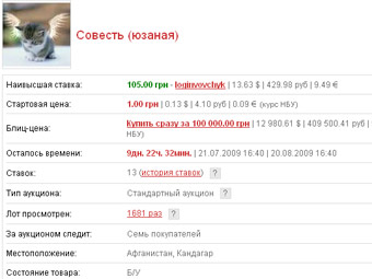Бывшую в употреблении совесть можно приобрести без торгов за 100 тысяч украинских гривен (почти 400 тысяч рублей). Стартовая цена, однако, значительно ниже - 1 гривна. На момент написания этой заметки за украинскую совесть предлагали самое большее 105 гривен. Свою цену можно будет предложить еще в течение 10 дней.