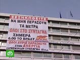 Десятки профсоюзных активистов заблокировали вход в здание, не допуская сотрудников внутрь, передает агентство AP. Их плакаты, один из которых вывешен на здании, гласят "Поднимайтесь - все на улицу против антинародных мер!"