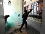 Группа людей в черной одежде отделилась от общей демонстрации и принялась закидывать краской витрины магазинов и банков на улицах Оксфорд и Новый Бонд