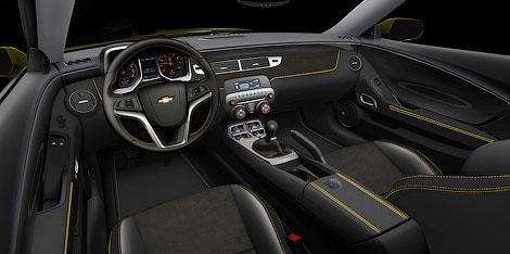 Интерьер особого [Камароk будет отделан черной кожей с желтой прострочкой на приборной панели, центральной консоли, подлокотниках и креслах. На поголовниках сидений также будет вышит логотипP[Автоботовk.