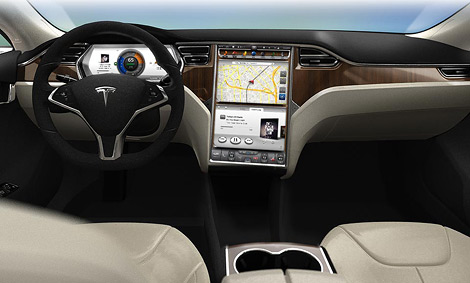 Одной из особенностей интерьера Tesla Model S является 17-дюймовые сенсорный экран мультимедийной системы на центральной консоли. Система имеет доступ в интернет по сетям 4G, использует для навигации карты Google Earth, оснащена голосовым управлением и возможность подключения iPhone и смартфонов на базе ОС Android.