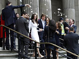 Регистрационный отдел лондонского округа Вестминстер уже объявил их мужем и женой, и новобрачные предстали пред очами представителей общественности и СМИ на ступенях этого ЗАГСа