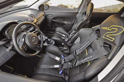 На тюнинг-выставке SEMA состоялась премьера [заряженногоk варианта хэтчбека Mazda2, оснащенного 2,3-литровым турбированным двигателем мощностью 260 лошадиных сил. Такой же агрегат устанавливается на [трешкуk в модификации MPS. Помимо нового мотора, новинка также получила дополнительные аэродинамические элементы кузова (передний и задний спойлеры, а также накладки на пороги), спортивную подвеску HR, стабилизаторы поперечной устойчивости Corksport и мощные тормозные механизмы Brembo с 330-миллиметровыми дисками на передней оси. Кроме того, на [заряженныйk хэтчбек установили 17-дюймовые колесные диски OZ Racing с покрышками Yokohama ADVAN Neova размерности 215/40. В салоне турбированной Mazda2 появились спортивные [ковшиk и гоночная электронная панель приборов. Динамические характеристики новинки пока не сообщаются. Для сравнения, Mazda3 MPS с таким мотором способна ускоряться с нуля до ста километров в час за 6,1 секунды. Максимальная скорость машины составляет 250 километров в час.