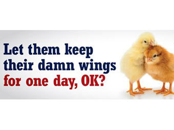 Американцы традиционно едят куриные крылья во время показа Super Bowl. Как сообщает PETA, ради производства куриных крыльев для одного Super Bowl уничтожается около 600 миллионов цыплят. Поэтому на своем рекламном постере PETA изобразила двух цыплят со слоганом: "Дайте им пожить хотя бы день с их чертовыми крыльями". Кроме того, PETA составила на своем сайте список вегетарианских рецептов, которыми можно заменить традиционные куриные крылья.