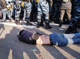 Ранее пресс-служба Центра спецназначения ГУ МВД по столице сообщила о том, что пострадали 12 бойцов ОМОН, трое из которых получили травмы головы. "У двоих разбиты подбородки, семеро получили ожоги глаз после того, как неизвестные распылили газовые баллончики", - сказали в пресс-службе.