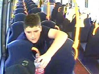 Полиция обнародовала кадры с камеры видеонаблюдения, установленной в автобусе. На них виден молодой человек с темными волосами, жующий спинку кресла. В руках от держит пластиковую бытулку с красной этикеткой. Всех свидетелей происшествия полиция немедленно связаться с ней.