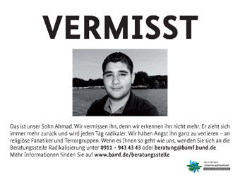 На сайте кампании можно увидеть четыре таких плаката, на трех из которых изображены немец Тим, а также мигранты Ахмад, Хасан и Фатима. Все фотографии подписаны одним и тем же текстом: "Мы скучаем по нему (ней), так как не узнаем его (ее) больше. Он (она) все больше отдаляется и становится радикальнее с каждым днем. Мы боимся окончательно потерять его (ее), если он (она) примкнет к фанатикам и террористам".